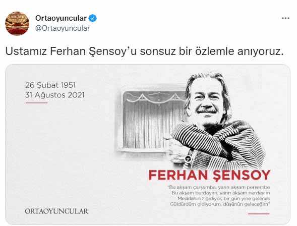 Yaşamını tiyatroya adayan Ferhan Şensoy'u Ortaoyuncu'lar, "Ustamız Ferhan Şensoy’u sonsuz bir özlemle anıyoruz. " notu ile andı.