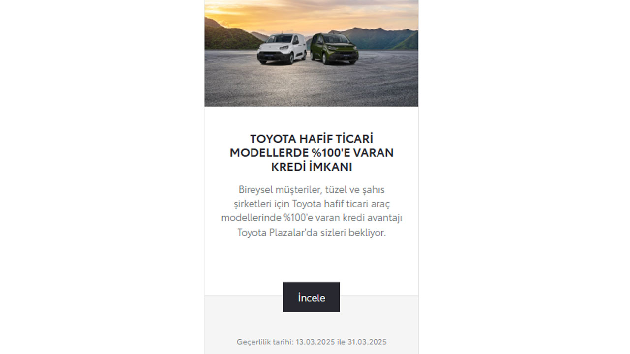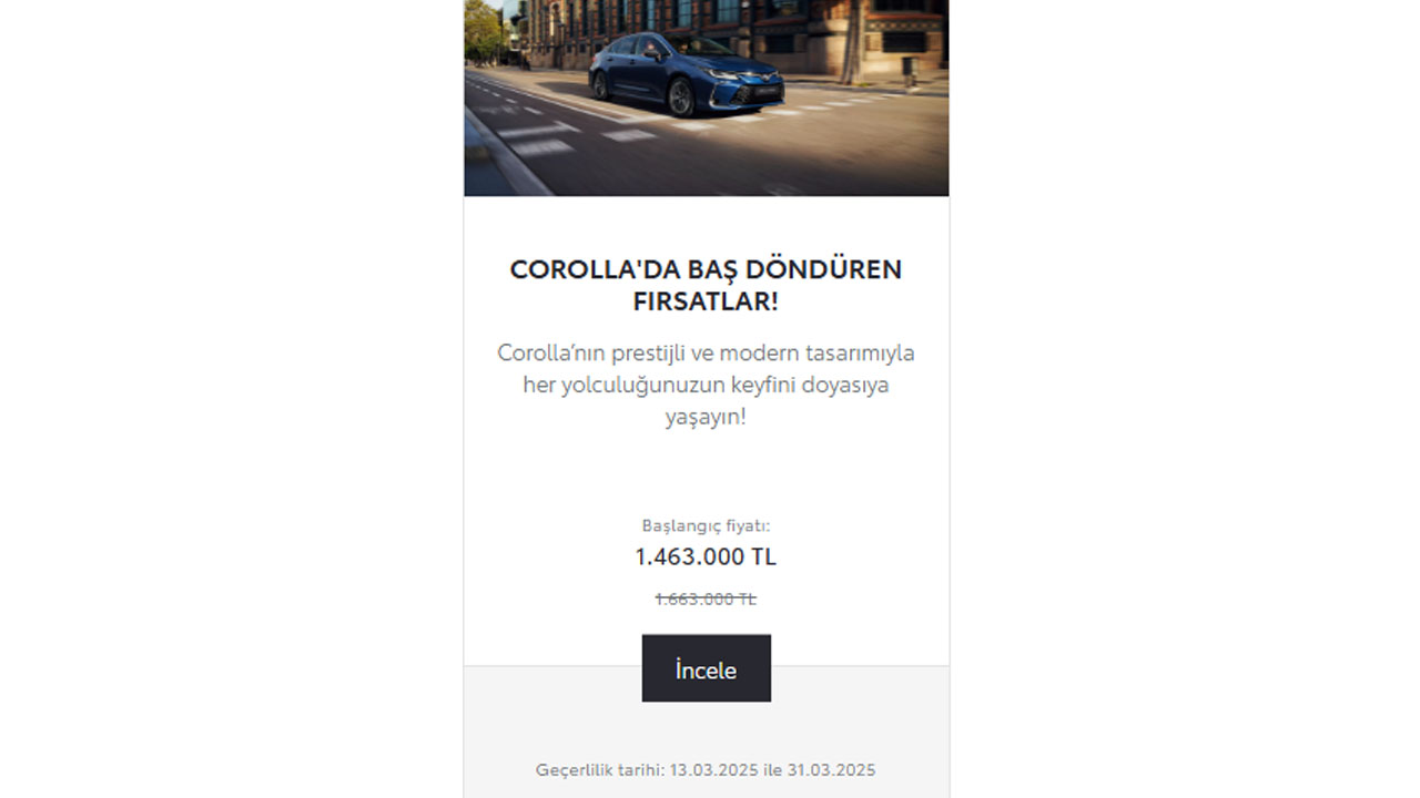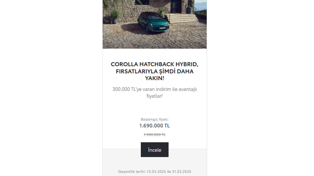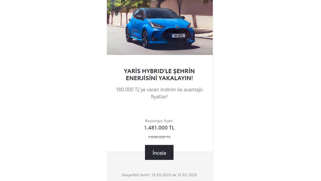 Araç sahibi olmak isteyen birçok vatandaş tarafından otomotiv devlerinin mart ayı kampanyaları araştırılıyor. Toyota'nın da dikkat çekici birçok kampanyası bulunuyor. Toyota'nın hibrit modelinde 300 bin TL'ye varan indirim yapması ise yüzleri güldürüyor. İşte, Toyota'nın kampanyalarından bazıları...