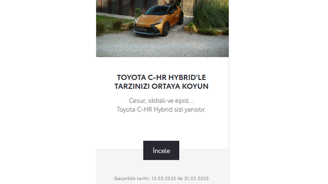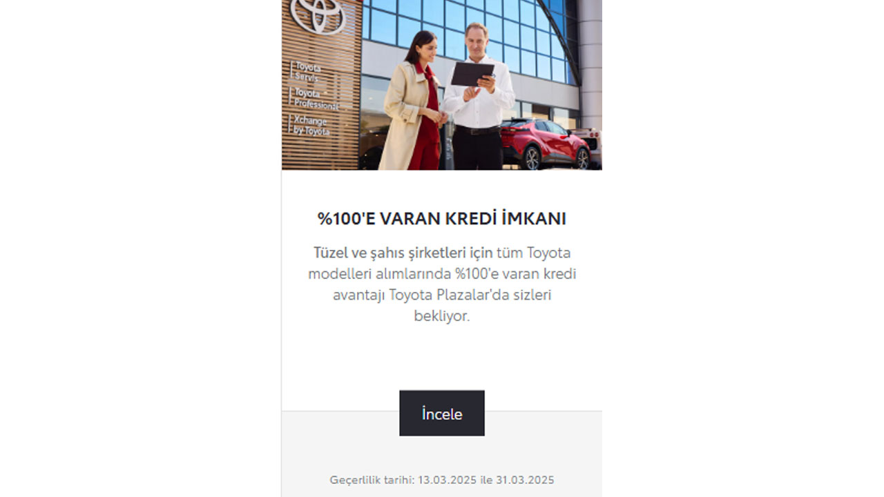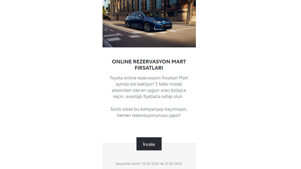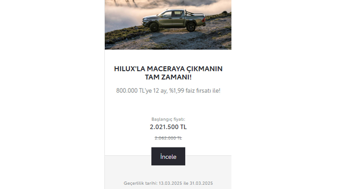 Araç sahibi olmak isteyen birçok vatandaş tarafından otomotiv devlerinin mart ayı kampanyaları araştırılıyor. Toyota'nın da dikkat çekici birçok kampanyası bulunuyor. Toyota'nın hibrit modelinde 300 bin TL'ye varan indirim yapması ise yüzleri güldürüyor. İşte, Toyota'nın kampanyalarından bazıları...