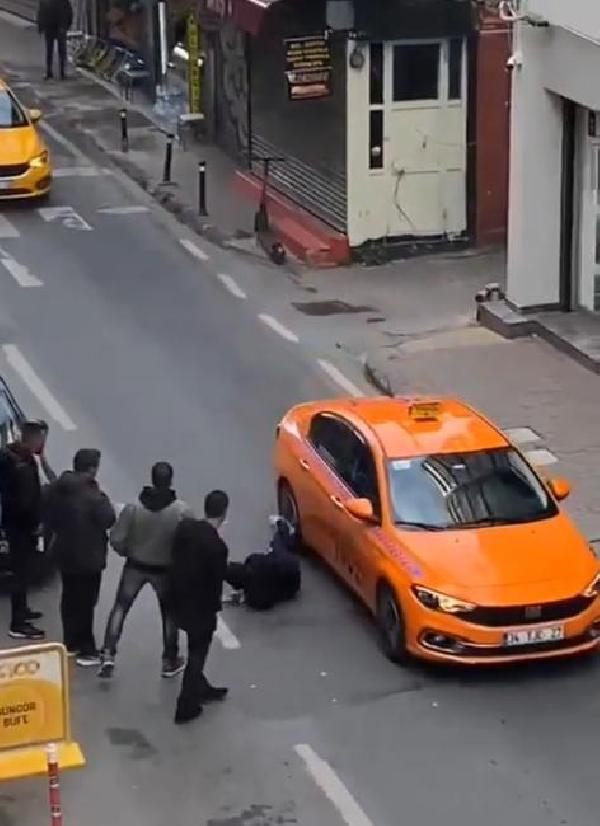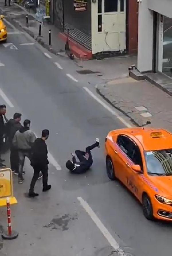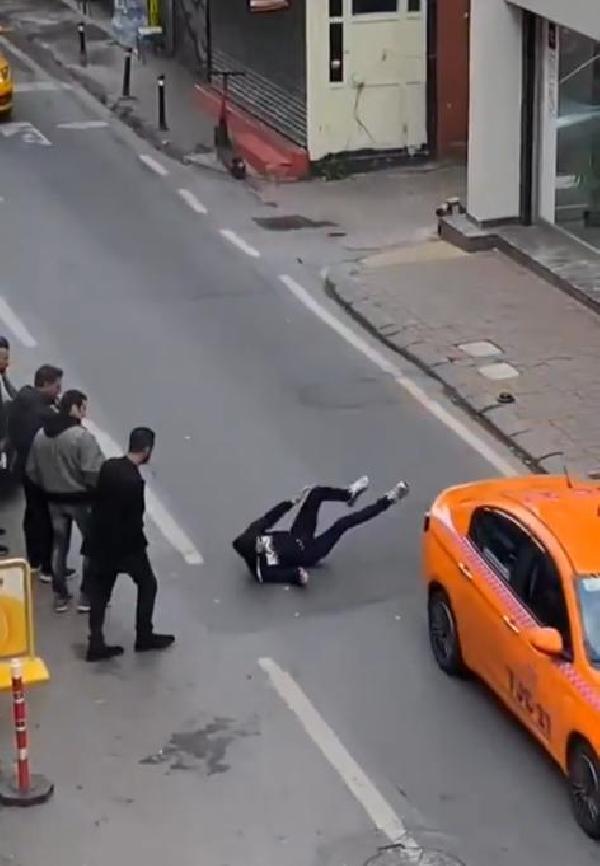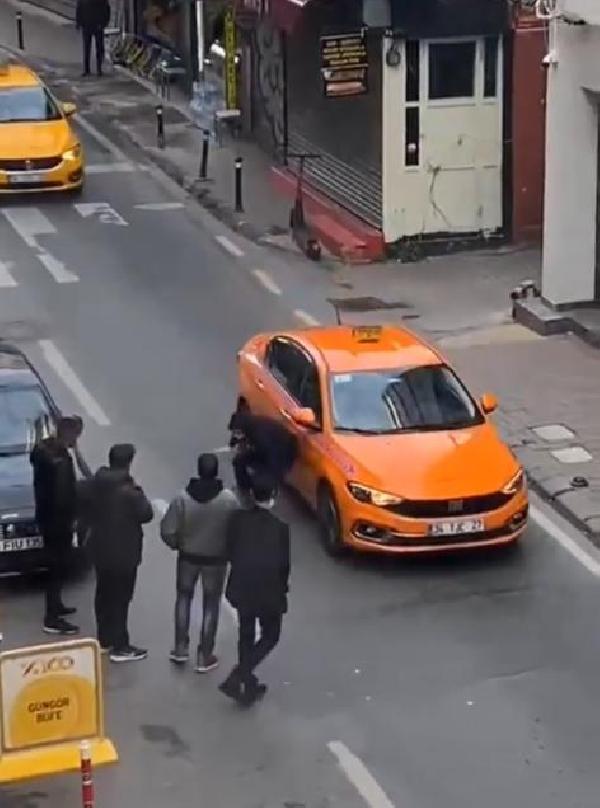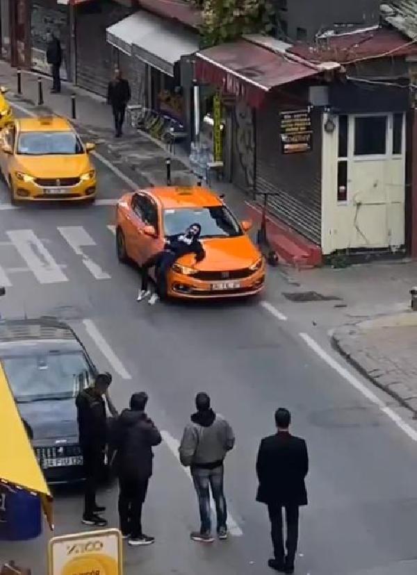 Bir taksinin kaputunun üzerine uzanan kişi, taksinin manevra yapıp hareket etmesiyle yere düştü.