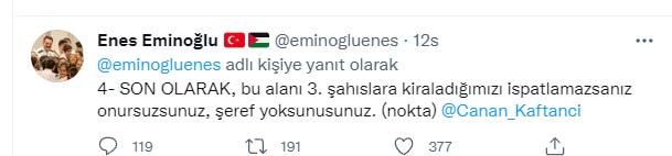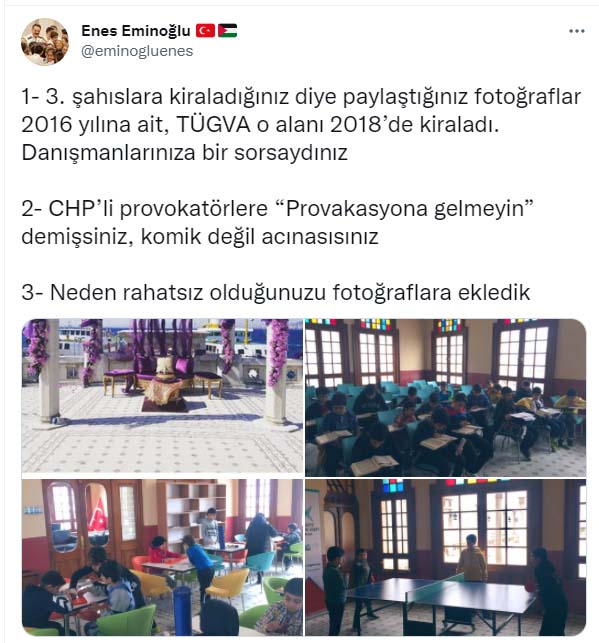 TÜGVA Başkanı Enes Eminoğlu ise Kaftancıoğlu'nun paylaştığı görsellerin 2016 yılına ait olduğunu iddia ederek söz konusu alanı kendilerinin 2018 yılında kiraladıklarını söyledi.