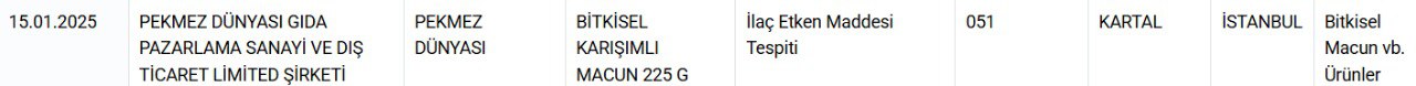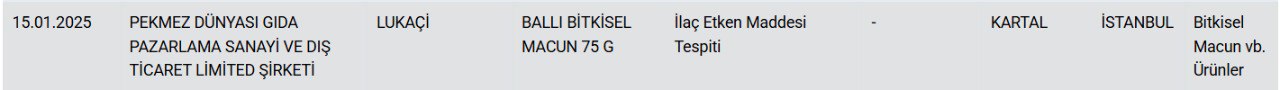 Bakanlığın açıklamasına göre, İstanbul Kartal’da faaliyet gösteren Pekmez Dünyası Gıda Pazarlama şirketine ait “Lukaçi” markalı ballı bitkisel macun ve bitkisel karışımlı macunlarda ilaç etken maddesi tespit edildi.