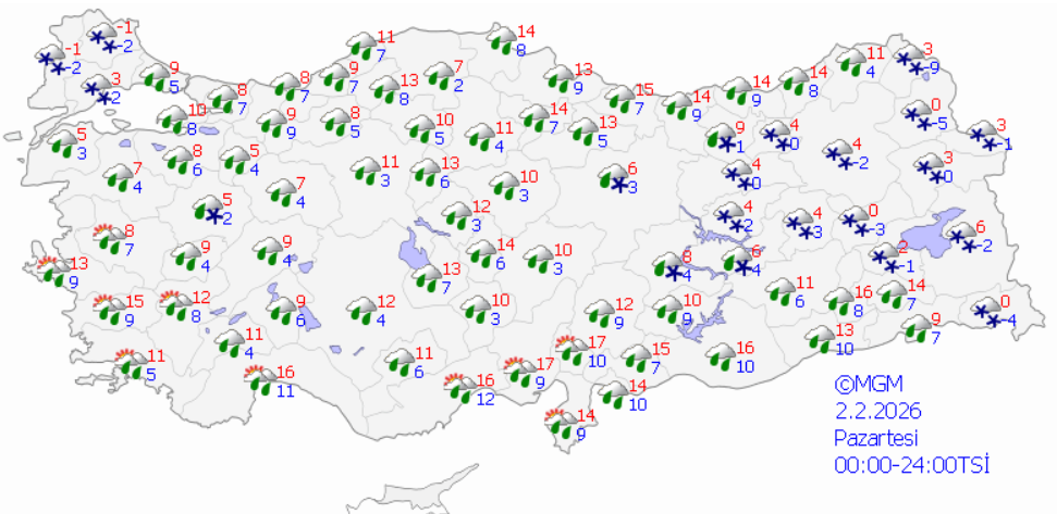 Yağışların; Marmara'nın batısı, Kıyı Ege ve Batı Akdeniz ile Manisa ve Denizli'de yerel kuvvetli olması bekleniyor.