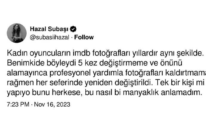 Söz konusu olayın bilinçli bir şekilde mi gerçekleştirildiği merak edilirken ünlü oyuncu Hazal Subaşı da platformdaki profil fotoğraflarının yıllardır aynı şekilde olduğunu dile getirdi.