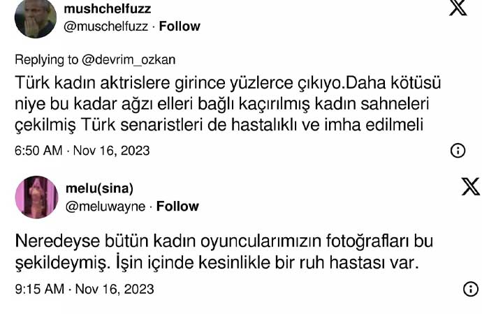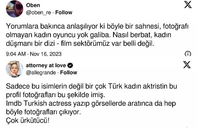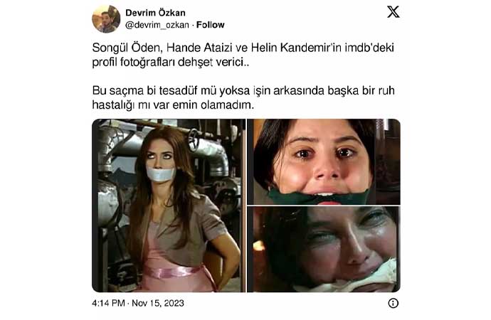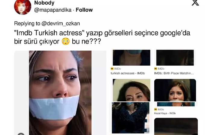 X (Twitter) kullanıcıları, Türk aktrislerin profil fotoğraflarının ekran görüntülerini paylaşarak konuyu gündeme taşıdı. Songül Öden, Hande Ataizi, Helin Kandemir, Sıla Türkoğlu, Sibel Taşçıoğlu ve daha birçok oyuncunun profil fotoğrafının, ağızlarının bağlı olduğu rahatsız edici sahnelerden alınmış olduğu görüldü.