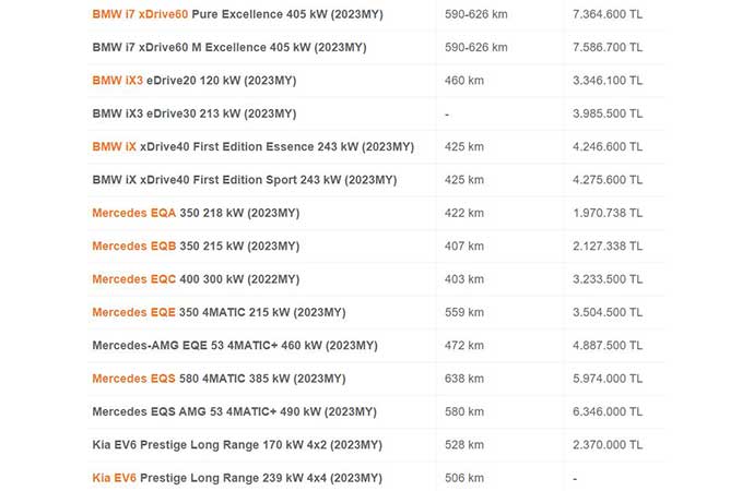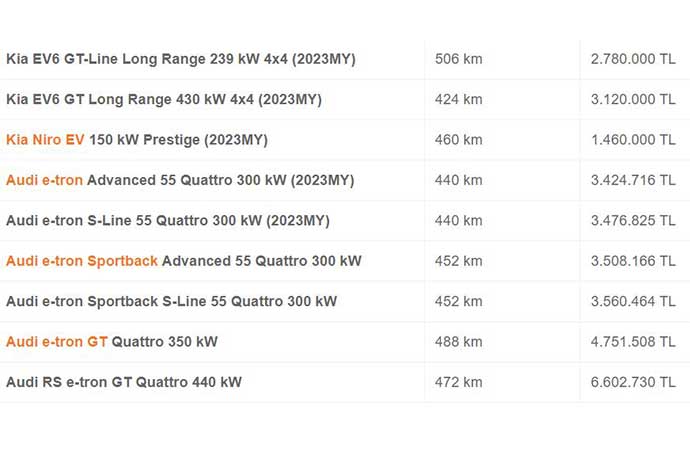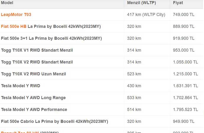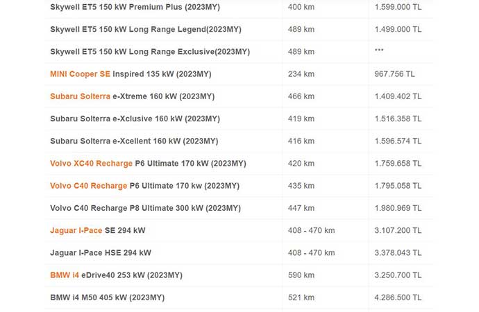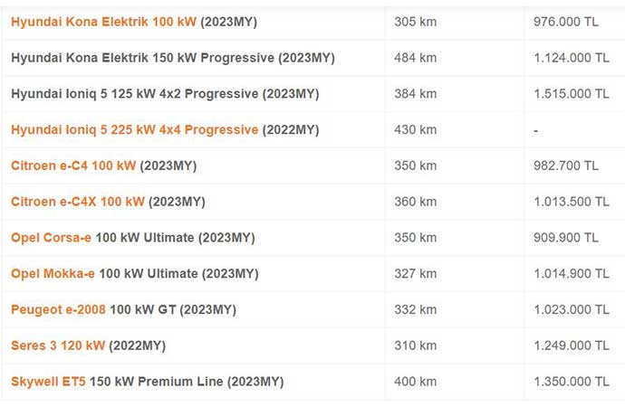 Donanım Haber'in derlediğine göre Türkiye'de satılan elektrikli otomobillerin fiyatları şu şekilde: