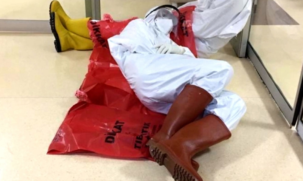 Şanlıurfa'da görevli Anestezi Teknikeri Muhammed Ali Şanda birazdan başlayacak mesaisine… Oysa ki aylardır beyin yorgun beden yorgun… Sırtını dayayarak duvara dinlenmeye çalışıyor. Şanda o anı şöyle anlatıyor: Kendimizi yere bıraktığımız bir zamanda hemşire arkadaşımız görüntülemişti bizi. Daha sonra fotoğrafa baktığımızda ne kadar yorgun ve bitkin olduğumuzu gördük.