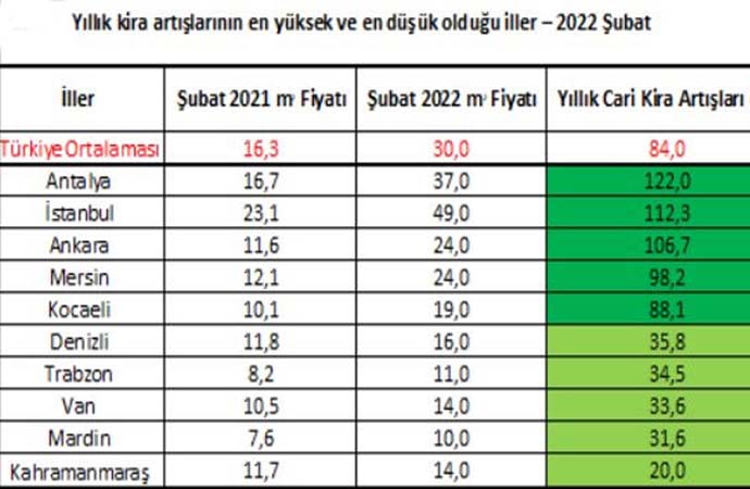 En yüksek yıllık kira artışının görüldüğü iller Antalya yüzde 122, İstanbul yüzde 112,3, Ankara yüzde 106,7, Mersin yüzde 98,2 ve Kocaeli yüzde 88,1 olarak ölçüldü.