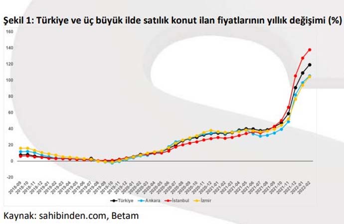 Satılık konut fiyatlarının artış hızı İstanbul'da 10,4, Ankara'da 8,4, İzmir'de 10,5 puan yükseldi. Böylece, satılık konut cari fiyatındaki yıllık artış oranı İstanbul’da yüzde 137,9, Ankara’da yüzde 105,5 ve İzmir’de yüzde 104,5 oldu.