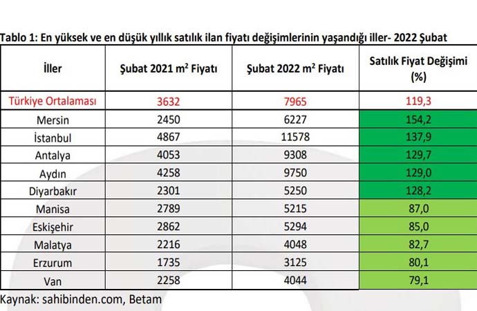 Satılık konut fiyatlarında da tablo farklı değil. BETAM'ın raporuna göre şubat ayında Türkiye geneli satılık konut fiyatları 10,2 puanlık yükselişle yüzde 119,3 oldu ve raporlarda incelenen dönemdeki yeni en yüksek seviyesine ulaştı. Buna bağlı olarak geçen yılın aynı ayında 3 bin 632 TL olan Türkiye geneli ortalama satılık konut ilan metrekare fiyatı 7 bin 965 TL'ye yükseldi.