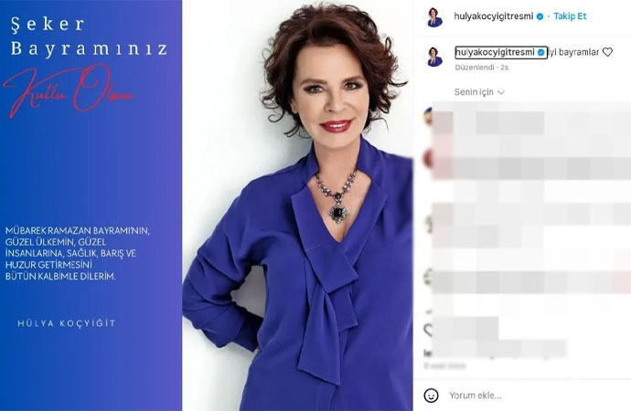 Hülya Koçyiğit: Mübarek Ramazan Bayramı'nın, güzel ülkemin güzel insanlarına sağlık, barış ve huzur getirmesini bütün kalbimle dilerim.