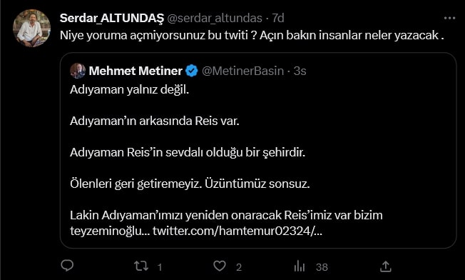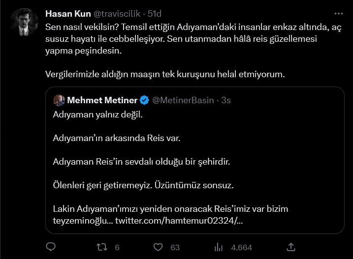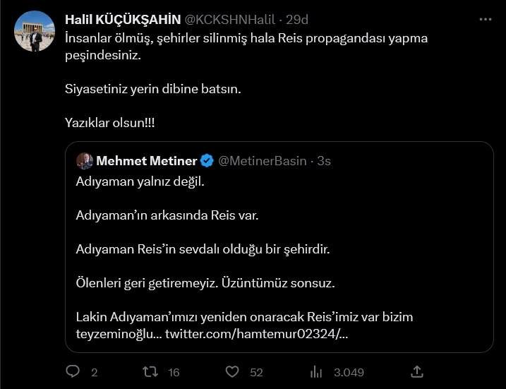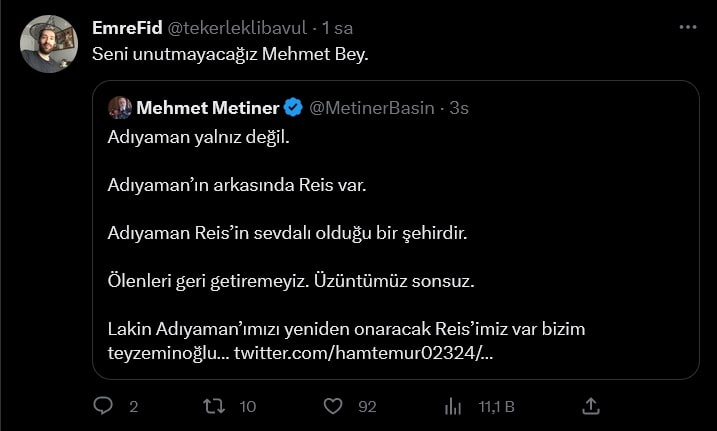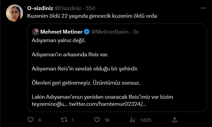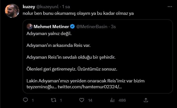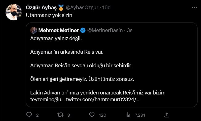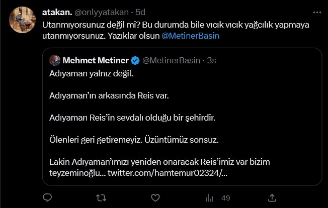 Twitter hesabından, "Adıyaman yıkık, Adıyaman yalnız, Adıyaman üşüyor. Kahta da 48 vatandaşımızı an itibarıyla kaybettik" diyen bir yurttaşa Erdoğan övgüsü yapan eski AKP Milletvekili Mehmet Metiner büyük tepki topladı.