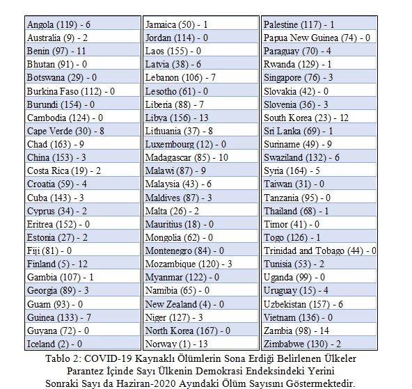Demokrasi Endeksinde yer alan ve ölümlerin sona erdiği hesaplanan ülkeler Tablo 2 de gösterilmektedir.
