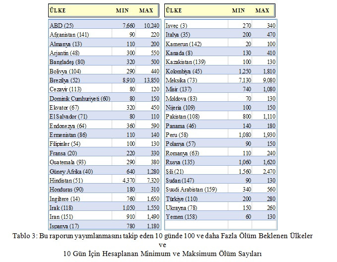 Bu ülkelerden 45 tanesinde Bu raporun yayımlanmasını takip eden 10 gün içinde 100 veya daha fazla ölüm olacağını hesaplıyoruz.