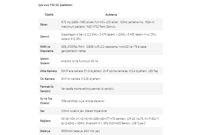 TUV Rheinland düşük ışık sertifikası ile de kullanıcıların göz sağlığını koruduğunu belirten yeni cihaz, arka tarafta 50 megapiksel ana kamera ve 2 megapiksel portre lense sahip. Önde ise 8 megapiksel selfie kamerası ile yeterli performans sunuyor. Android 14 tabanlı Funtouch OS 14 sistemi üzerinde çalışan vivo Y58 5G, 44W hızlı şarj desteğine sahip 6,000mAh batarya ile geliyor. Tek versiyon olarak 8GB + 128GB modelinde sunulan Y58 5G, 230 dolarlık fiyat etiketiyle Hindistan’da satışa çıktı.