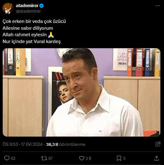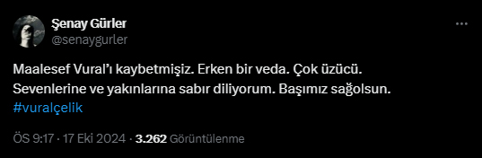 Avrupa Yakası dizisinde Kubilay Peynircioğlu ve Gülenay Peynircioğlu karakterlerine hayatveren oyuncu Vural Çelik 51 yaşında hayatını kaybetti. Çelik'in hayatını kaybetmesinin ardından Avrupa Yakası oyuncuları arka arkaya taziye paylaşımı yaptı.