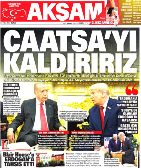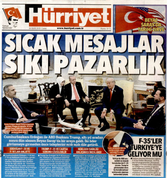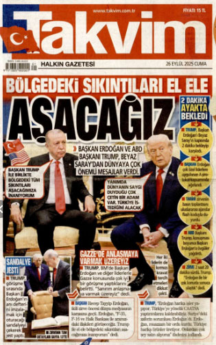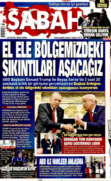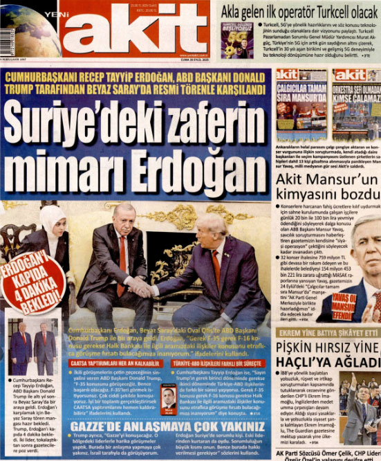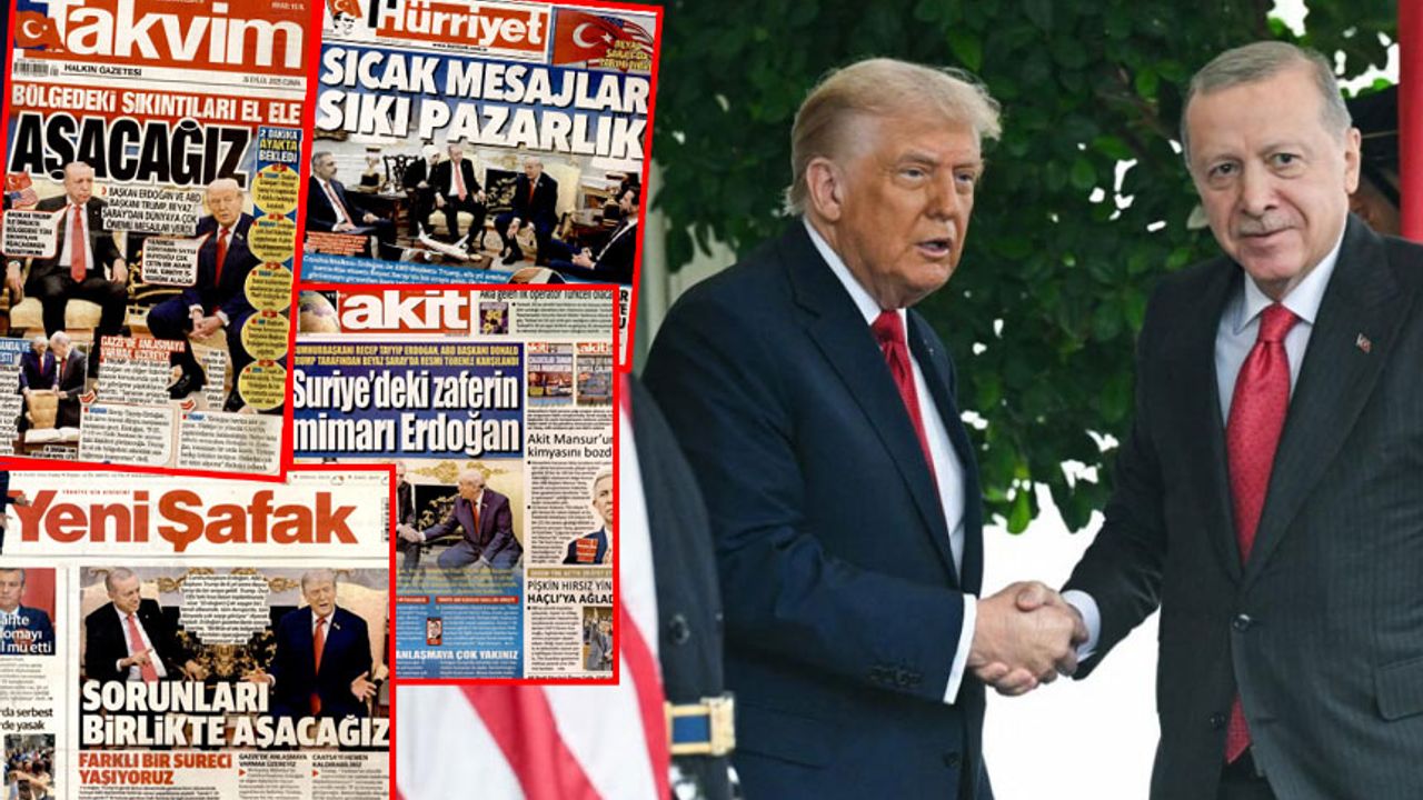 AKP'li Cumhurbaşkanı Erdoğan’ın ABD Başkanı Trump ile bir araya gelmesi gazetelerin manşetlerindeydi. İktidara yakın gazeteler haberi "tarihi zirve", “sıcak mesajlar”, “el ele aşacağız”, “birlikte başaracağız” gibi başlıklar ile verdi.