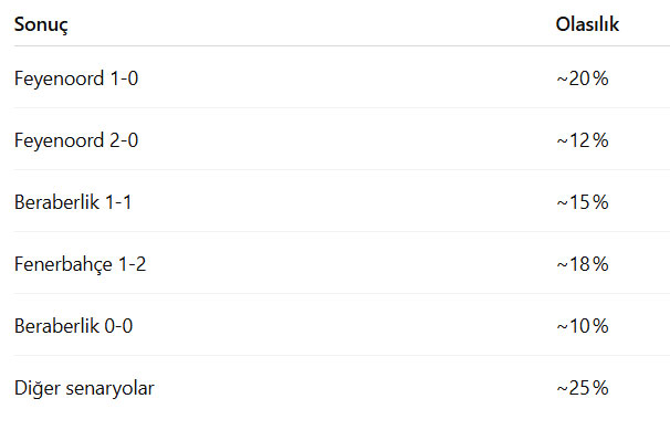 ChatGPT'ye göre, maçtaki en olası senaryo ev sahibi Feyenoord'un maçtan 1-0'lık galibiyetle ayrılması. Ancak yapay zeka botu, Fenerbahçe'nin karşılaşmada gol bulması durumunda karşılaşmayı kazanabileceğine de dikkat çekiyor. Sarı lacivertli ekibin maçta ilk golü atması durumunda karşılaşmadan 2-1'lik galibiyetle ayrılabileceği yüzde 18'lik oranla en güçlü ikinci senaryo. 1-1'lik beraberliğe verilen oran ise yüzde 15.