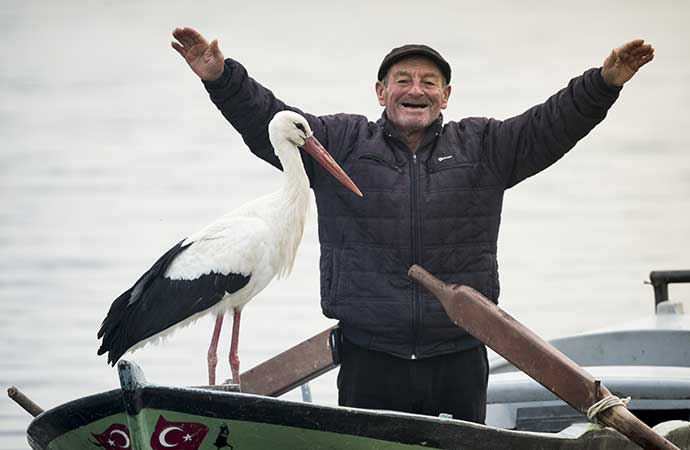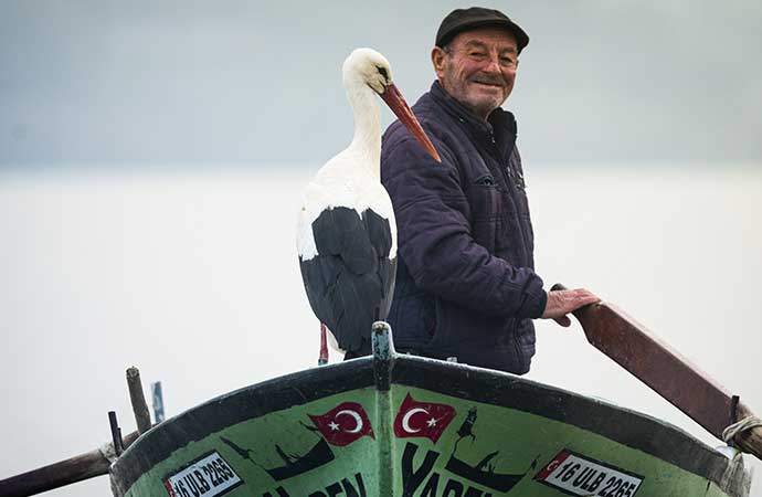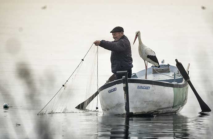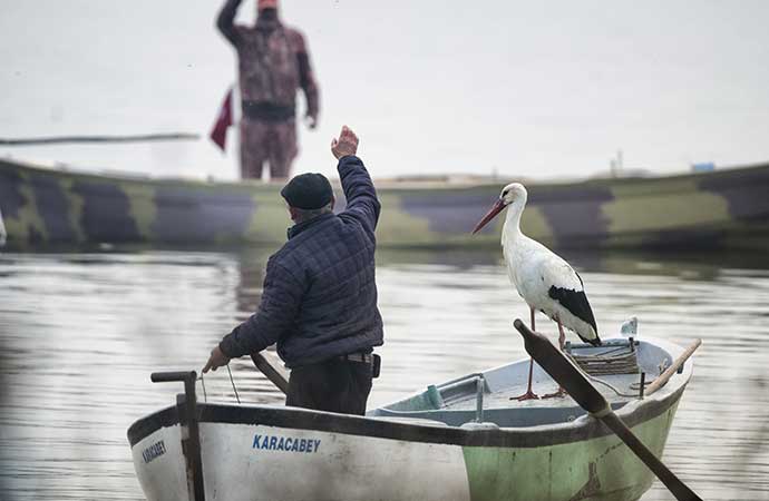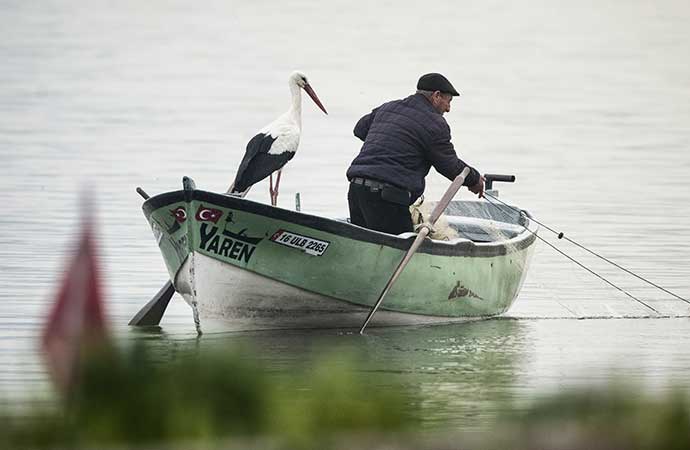 Yaren leyleğin, göl manzaralı yuvasının bulunduğu mahallede balıkçı Yılmaz'ın kayığındaki "geleneksel" pozu, doğa ve yaban hayatı fotoğrafçısı Alper Tüydeş tarafından kayda alındı.
