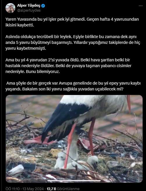 Yaren leylek ile eşi Nazlı’nın, soğuktan ve yağmurdan korumak için büyük mücadele verdiği yavrulardan 2’si geçen hafta hayatını kaybetti. Tüydeş, bu haberi de sosyal medya hesabından “Yaren Yuvasında bu yıl işler pek iyi gitmedi. Geçen hafta 4 yavrusundan 2’sini kaybetti. Aslında oldukça tecrübeli bir leylek. Eşiyle birlikte bu zamana dek aynı anda 5 yavru büyütmeyi başarmıştı. Yıllardır yaptığımız takiplerde de hiç yavru kaybetmemişti. Ama bu yıl 4 yavrudan 2’si yuvada öldü. Belki hava şartları belki bir hastalık nedeniyle öldüler. Belki de yuvaya taşınan yabancı cisimler nedeniyle. Bunu bilemiyoruz. Ama şöyle de bir gerçek var. Avrupa genelinde de bu yıl epey yavru kaybı yaşandı. Bakalım son 2 yavru sağlıkla yuvadan uçabilecek mi?” ifadeleriyle duyurdu.