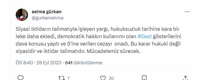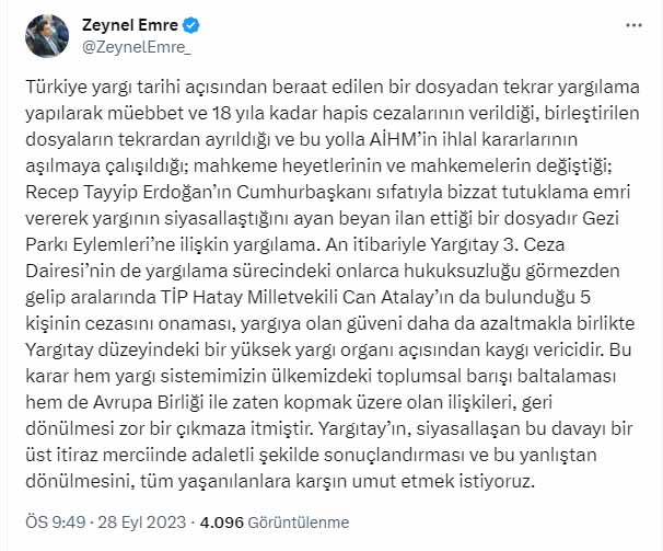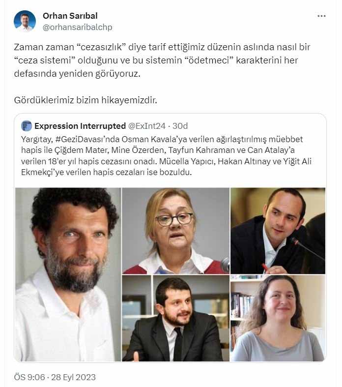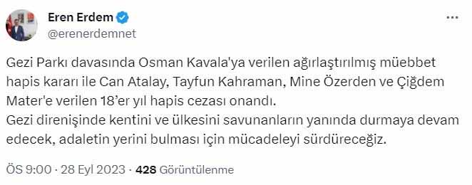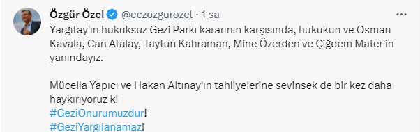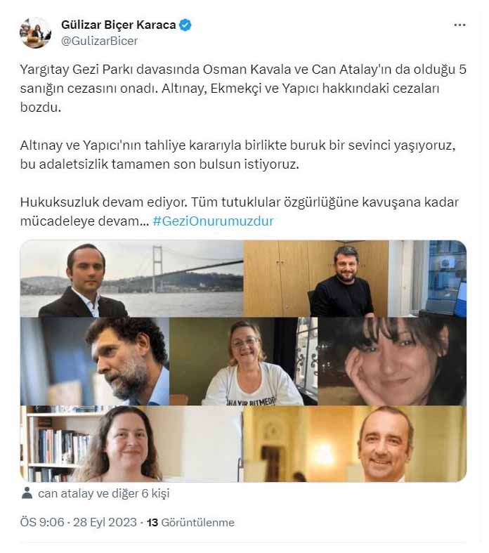 Yargıtay 3. Ceza Dairesi, İstanbul 13. Ağır Ceza Mahkemesi’nin, Gezi Parkı eylemleriyle ilgili davada, 25 Nisan 2022’de verdiği karara ilişkin temyiz incelemesini tamamladı. Yargıtay 3. Ceza Dairesi, 8 sanıklı Gezi Parkı davasında, Osman Kavala’ya verilen ağırlaştırılmış müebbet hapis ile Türkiye İşçi Partisi’nden (TİP) Hatay Milletvekili seçilen Can Atalay, Tayfun Kahraman, Mine Özerden ve Çiğdem Mater Utku’ya verilen 18’er yıl hapis cezalarını onadı. Ali Hakan Altınay, Yiğit Ali Ekmekçi ve Ayşe Mücella Yapıcı hakkında verilen 18’er yıl hapis cezaları ise Yargıtay 3. Ceza Dairesi tarafından bozuldu. Daire, mahkumiyet hükümlerini bozduğu sanıklar Yapıcı ile Altınay’ın adli kontrol hükümleri uygulanarak tahliyesini kararlaştırdı.