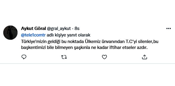 Yarışmacının jokerlerini kullanarak soruyu yanıtlaması ise sunucu İmirzalıoğlu’nun dikkatini çekti. “İyi ki hangi ülke olduğu sorulmadı” diyen İmirzalıoğlu, “Türkiye’nin başkenti hiç değişmedi, hiç tartışılmadı. Sana söylüyorum seyircilerimiz de anlasın” ifadelerini kullandı.