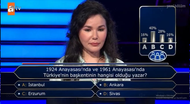 Yarışmacı Türkiye'nin başkenti sorusunda çift joker hakkını harcarken seyirci jokerinde stüdyoda bulunan seyircilerden yüzde 40'ı Ankara geriye kalan yüzde 60'ı ise İstanbul, Erzurum ve Sivas yanıtını verdi.