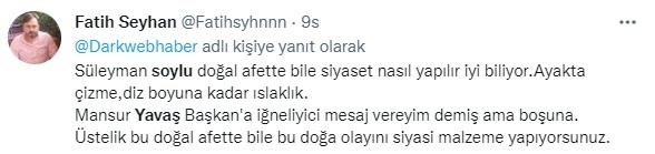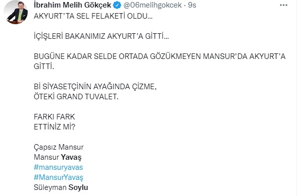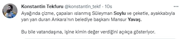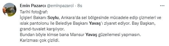 Selin etkili olduğu Ankara'nın Akyurt ilçesinde incelemelerde bulunan Süleyman Soylu, bölge esnafından bilgi aldı. İncelemeleri ardından Soylu, durum değerlendirmesi için Ankara Büyükşehir Belediyesi Başkanı Mansur Yavaş'ı makamında ziyaret etti. Görüşmeye dizine kadar ıslak pantolon ve çizme ile gelen Soylu’nun fotoğrafı dikkati çekti.