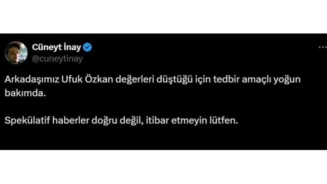 "Arkadaşımız Ufuk Özkan değerleri düştüğü için tedbir amaçlı yoğun bakımda. Spekülatif haberler doğru değil, itibar etmeyin lütfen."