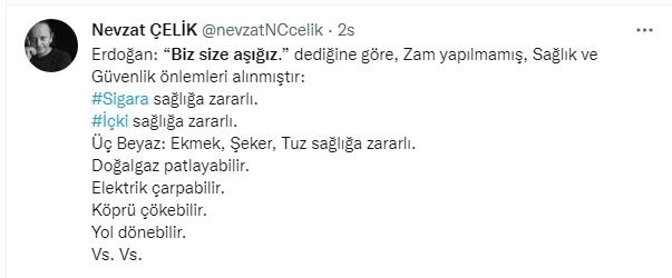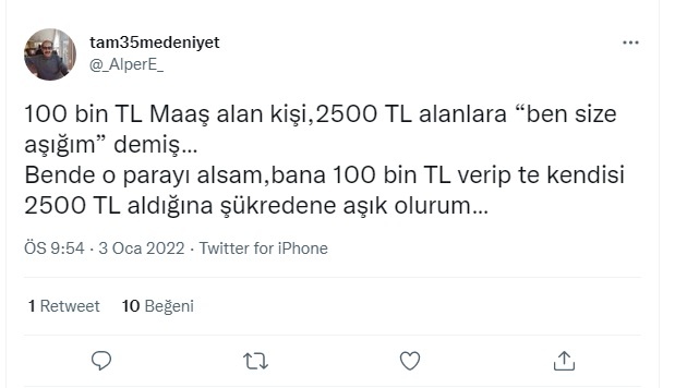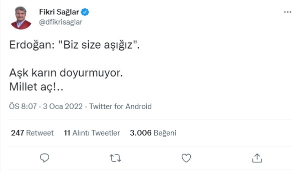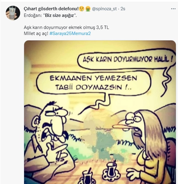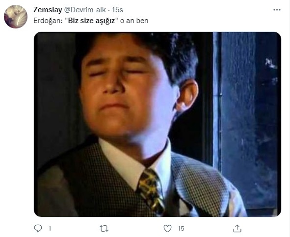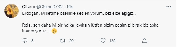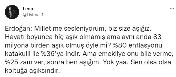 Bir sosyal medya kullanıcısı Erdoğan'ın daha önce kullandığı "Maalesef hiç aşık olmadım" sözlerini paylaştı ve "Hayatı boyunca hiç aşık olmamış ama aynı anda 83 milyona birden aşık olmuş öyle mi? %80 enflasyonu katakulli ile %36'ya indir. Ama emekliye onu bile verme, %25 zam ver, sonra ben aşığım. Yok yaa. Sen olsa olsa koltuğa aşıksındır" yorumunda bulundu. Sosyal medyadaki tepkilerden bazıları şöyle...