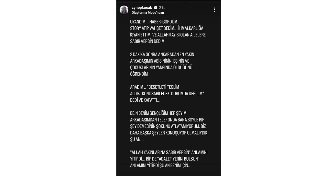 Zeynep Koçak, Instagram hesabından yaptığı paylaşımda, "Ankara'dan en yakın arkadaşımın abisinin, eşinin ve çocuklarının yangında öldüğünü öğrendim" ifadelerini kullandı.