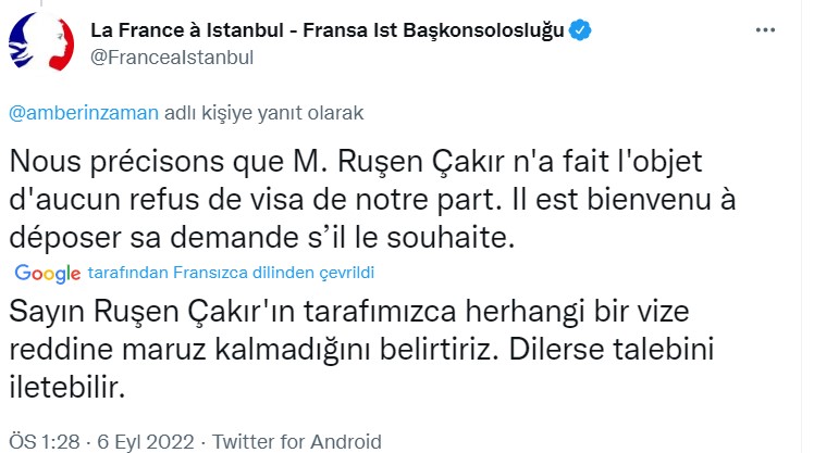 Fransa'ya yaptığı Schengen vize başvurusunun reddedildiğini öne süren Gazeteci Ruşen Çakır'a Fransa Başkonsolosluğu'ndan yanıt geldi.