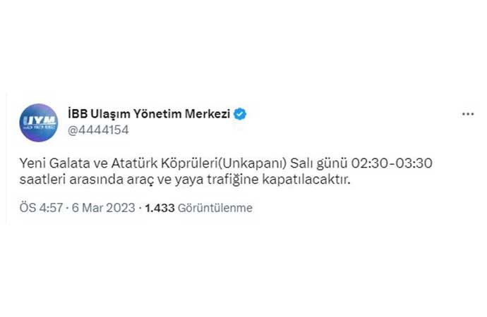 Sosyal medyadan yapılan açıklamada, “Yeni Galata ve Atatürk Köprüleri(Unkapanı) Salı günü 02:30-03:30 saatleri arasında araç ve yaya trafiğine kapatılacaktır” ifadeleri kullanıldı.