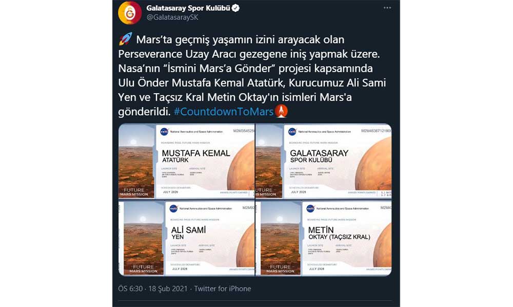 Galatasaray Kulübü, NASA'nın 'İsmini Mars’a Gönder' projesi kapsamında Mustafa Kemal Atatürk, Ali Sami Yen ve Metin Oktay'ın isimlerini Mars'a gönderdiklerini açıkladı. Galatasaray'ın Twitter hesabından yapılan açıklamada ABD Havacılık ve Uzay Ajansı’nın (NASA) 'İsmini Mars’a Gönder' projesi kapsamında Mustafa Kemal Atatürk'ün, Galatasaray'ın kurucusu Ali Sami Yen'in ve Metin Oktay'ın isimlerinin Mars'a gönderildiği belirtildi. Galatasaray yaptığı paylaşımda şu ifadeleri kullandı: "Mars’ta geçmiş yaşamın izini arayacak olan Perseverance Uzay Aracı gezegene iniş yapmak üzere. Nasa’nın “İsmini Mars’a Gönder” projesi kapsamında Ulu Önder Mustafa Kemal Atatürk, Kurucumuz Ali Sami Yen ve Taçsız Kral Metin Oktay'ın isimleri Mars'a gönderildi." İşte o paylaşım: