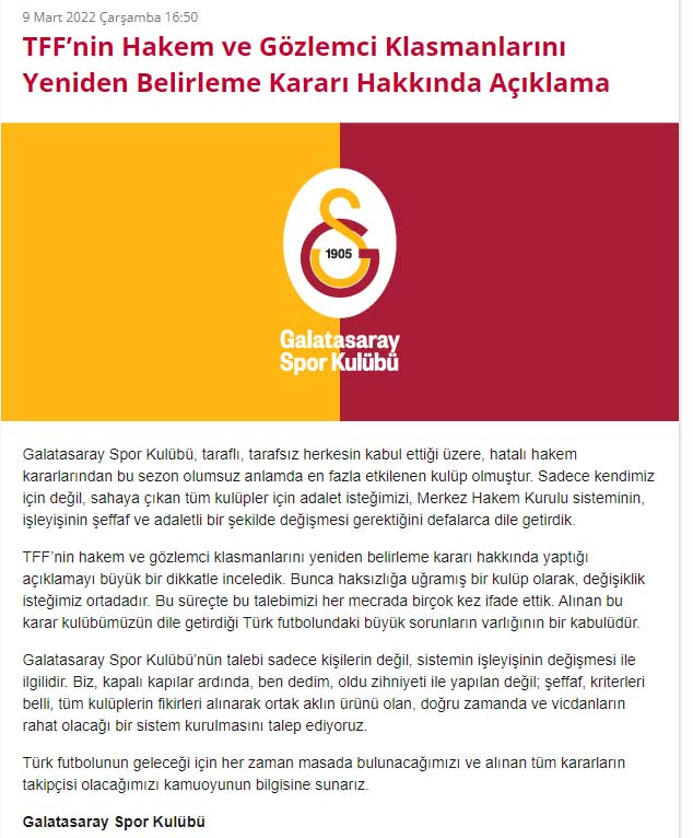 "Galatasaray Spor Kulübü’nün talebi sadece kişilerin değil, sistemin işleyişinin değişmesi ile ilgilidir. Biz, kapalı kapılar ardında, ben dedim, oldu zihniyeti ile yapılan değil; şeffaf, kriterleri belli, tüm kulüplerin fikirleri alınarak ortak aklın ürünü olan, doğru zamanda ve vicdanların rahat olacağı bir sistem kurulmasını talep ediyoruz. Türk futbolunun geleceği için her zaman masada bulunacağımızı ve alınan tüm kararların takipçisi olacağımızı kamuoyunun bilgisine sunarız."