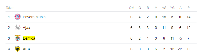 Benfica Şampiyonlar Ligi 'nde Bayern Münih ve Ajax'ın ardında grubu 3. tamamlamıştı.
