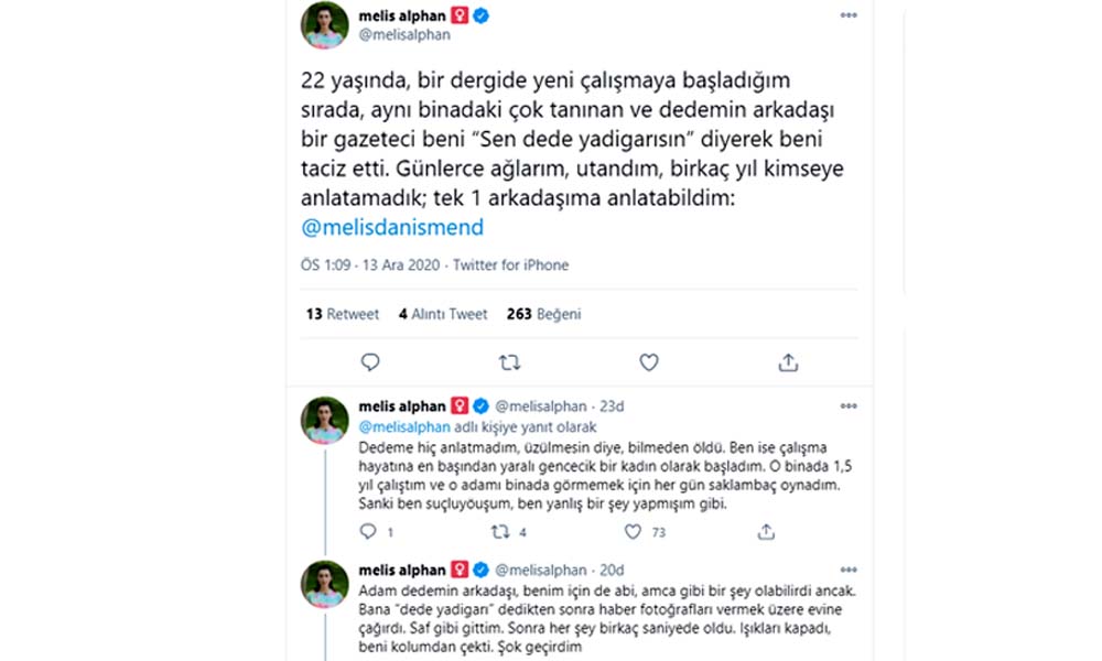 22 yaşında, bir dergide yeni çalışmaya başladığım sırada, aynı binadaki çok tanınan ve dedemin arkadaşı bir gazeteci beni “Sen dede yadigarısın” diyerek beni taciz etti. Günlerce ağlarım, utandım, birkaç yıl kimseye anlatamadık; tek 1 arkadaşıma anlatabildim: