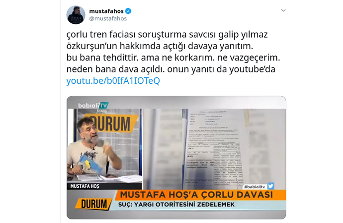 Gazeteci Mustafa Hoş’a Çorlu Tren Katliamına ilişkin haberleri nedeniyle dava açıldı. Haberi Babıali TV’deki yayınında duyuran Mustafa Hoş, davanın Çorlu tren kazasını soruşturan Cumhuriyet Savcısı Galip Yılmaz Özkurşun tarafından açıldığını söyledi. Hoş, “Yargı otoritesini bilinçli olarak baskı altına almak”la suçlanıyor. Babıali TV’deki yayınında davaya tepki gösteren Hoş, savcının kazayı soruştururken görevini yapmadığını ve bunu söylemeye devam edeceğini ifade etti. Mustafa Hoş twitterdan paylaştığı mesajda, "Çorlu tren faciası soruşturma savcısı galip Yılmaz Özkurşun’un hakkımda açtığı davaya yanıtım. Bu bana tehdittir. Ama ne korkarım. Ne vazgeçerim. neden bana dava açıldı." dedi.