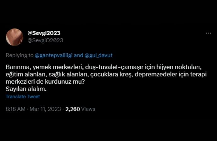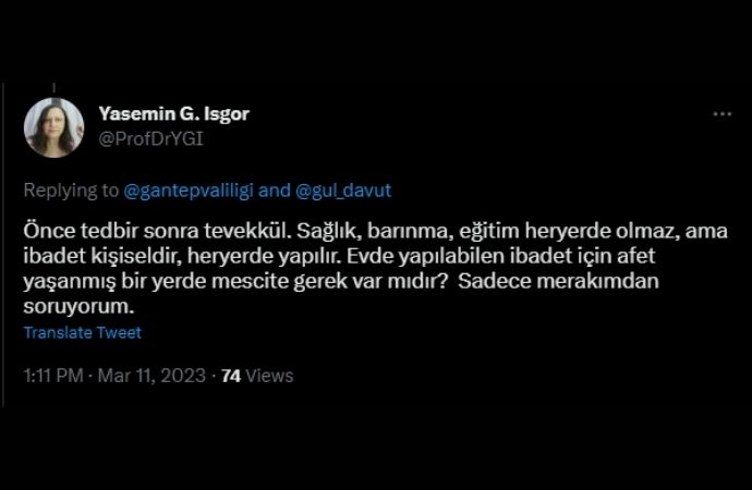 Gaziantep Valiliği sosyal medya platformu Twitter üzerinden paylaşımda bulundu. Valilik paylaşımında deprem bölgesine kurulan 23 adet çadır mescidi paylaştı. Paylaşımda, "5. Zırhlı Tugay Komutanlığı tarafından afet bölgesindeki mahallelere toplamda 23 adet mescit kurulumu tamamlandı" ifadelerine yer verilirken Gaziantep Valisi Davurt Gül de etiketlendi. https://twitter.com/gantepvaliligi/status/1634120140085161984?s=20 https://tele1.com.tr/pes-artik-mebin-deprem-illerinden-aldiklari-cadiri-bursaya-getirip-yine-bolgeye-gonderdi-iddiasina-sorusturma-803429/ Vatandaşların ise paylaşımın altında valiliğe tepki gösterdiği görüldü. Bir vatandaş, "Barınma, yemek merkezleri, duş-tuvalet-çamaşır için hijyen noktaları, eğitim alanları, sağlık alanları, çocuklara kreş, depremzedeler için terapi merkezleri de kurdunuz mu?" şeklinde tepki gösterirken bir başka vatandaş ise şunalrı söyledi: "Önce tedbir sonra tevekkül. Sağlık, barınma, eğitim heryerde olmaz, ama ibadet kişiseldir, heryerde yapılır. Evde yapılabilen ibadet için afet yaşanmış bir yerde mescite gerek var mıdır? Sadece merakımdan soruyorum"