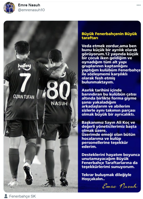 Büyük Fenerbahçenin büyük taraftarı: Veda etmek zordur, ama ben bunu küçük bir ayrılık olarak görüyorum. 12 yaşında küçük bir çocuk iken geldiğim ve oynadığım tüm alt yapı gruplarının kaptanlığını yaptığım kulübüm Fenerbahçe ile sözleşmemi karşılıklı olarak fesh etmiş bulunmaktayım. Asırlık tarihini içinde barındıran bu kulübün çatısı altında birlikte forma giyme şansı yakaladığım arkadaşlarım ve abilerim sizlerle aynı takımın parçası olmak büyük bir ayrıcalıktı. Başkanımız Sayın Ali Koç ve değerli yöneticilerimiz başta olmak üzere, üzerimde emeği olan bütün hocalarıma ve kulüp personellerine teşekkür ederim. Desteklerini hayatım boyunca unutamayacağım Büyük Fenerbahçe Taraftarlarına da teşekkürlerimi sunuyorum. Tekrar buluşmak dileğiyle Hoşçakalın...