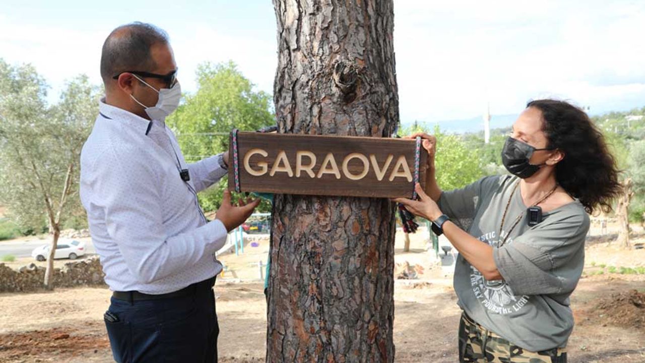 Etrim Mevkiinde, lavantaların boy gösterdiği ve çiçek açtığı lavanta bahçesi içinde bulunan ağaçların hepsine de isim verileceğini ifade eden Başkan Yardımcısı Tayfun Yılmaz, Sertab Erener ile birlikte ilk olarak İsmail Hakkı Tonguç Tarım Okulu ve Müzesi önünde bulunan çam ağacına “Garaova” ismi verildi.