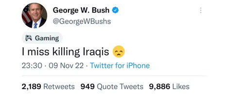 Twitter Blue aboneliği karşılığında mavi tık alan ve eski ABD Başkanını taklit eden ‘George W. Bush’ isimli bir kullanıcı, “Iraklıları öldürmeyi özledim” ifadelerinin yer aldığı bir paylaşım yaptı.