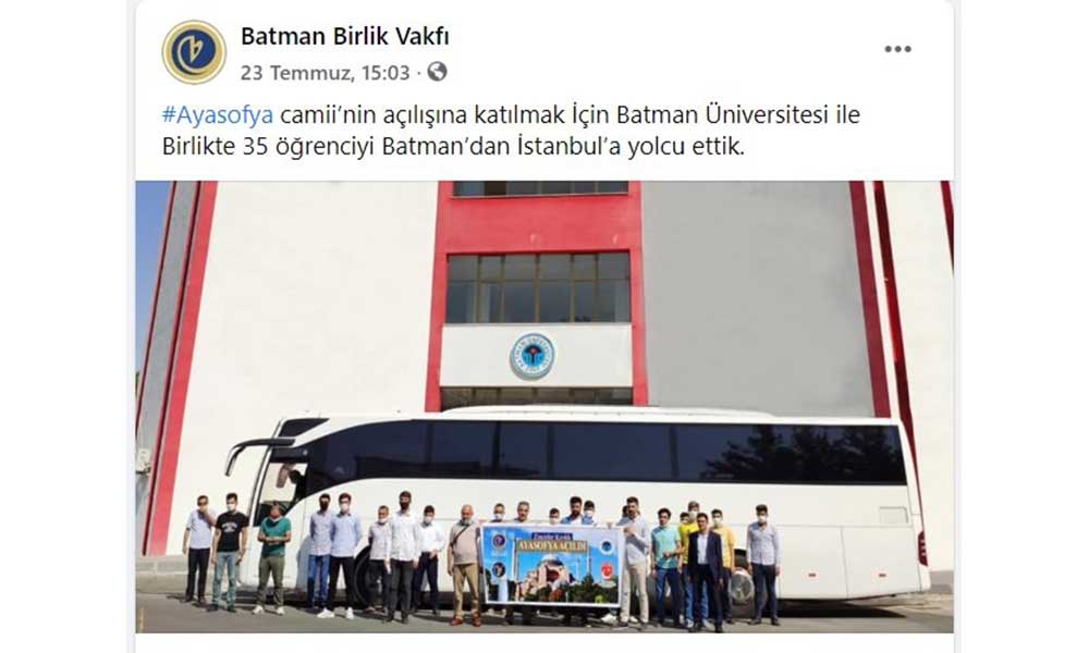 Vakfın Batman Şubesi tartışma yaratan bir karara imza attı. Şube, Ayasofya’nın açılışı nedeniyle 35 öğrenciyi Batman’dan İstanbul’a göndermeden önce Batman Üniversitesi yerleşkesinde tören düzenledi. Törende, yola çıkacak öğrencilerin fotoğrafları çekildi.