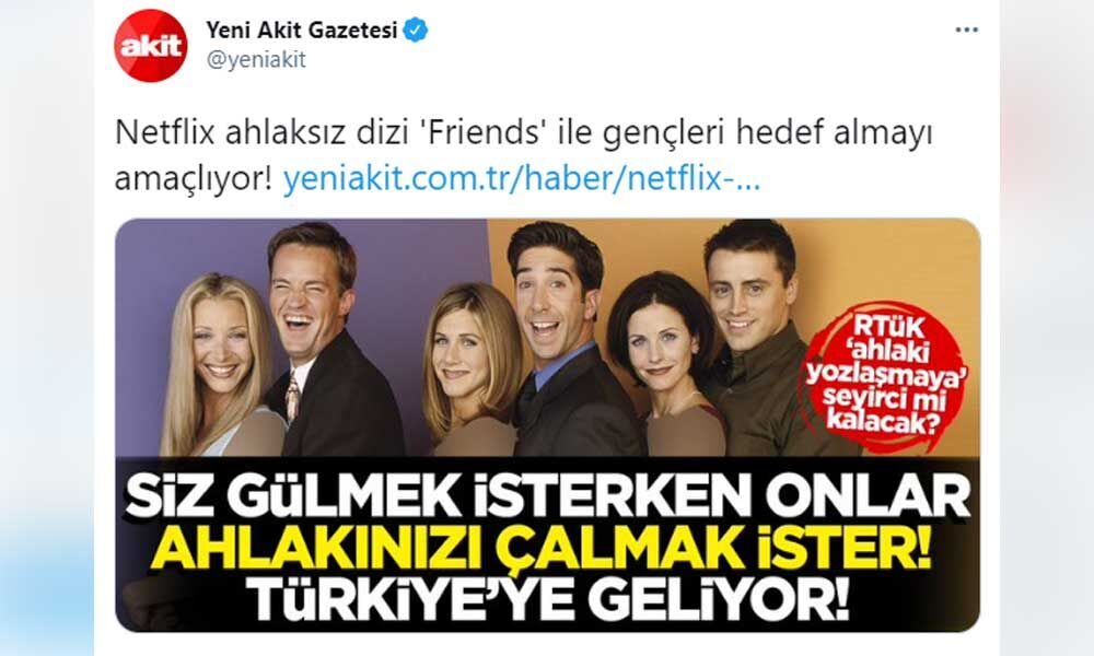 Yandaş ve gerici Yeni Akit, dünyaca ünlü Friends dizisini hedef aldı. Yeni Akit, Netflix Türkiye'de