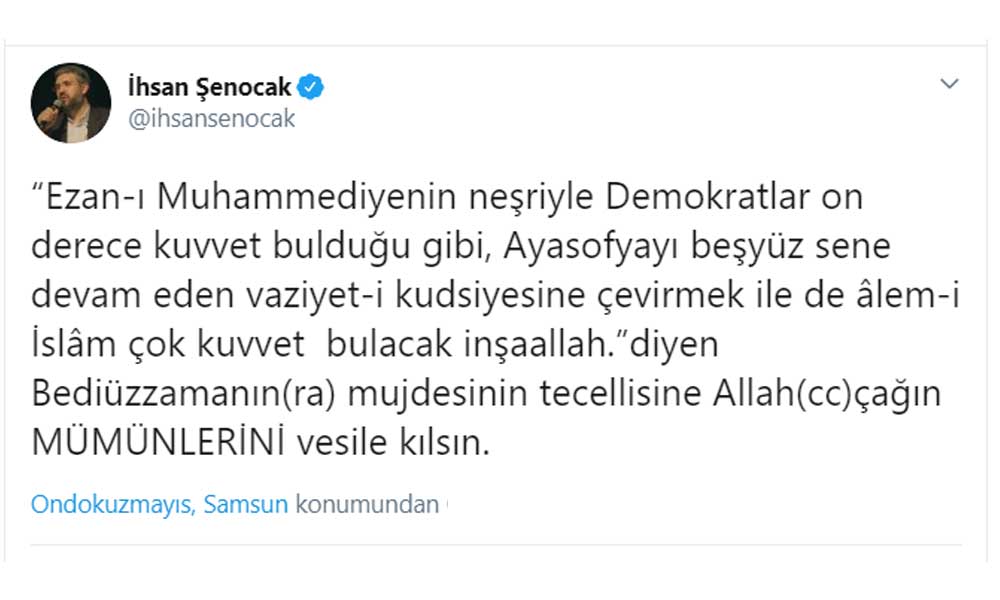 Gerici Şenocak'ın "Ezan-ı Muhammediyenin neşriyle Demokratlar on derece kuvvet bulduğu gibi, Ayasofyayı beşyüz sene devam eden vaziyet-i kudsiyesine çevirmek ile de âlem-i İslâm çok kuvvet bulacak inşaallah.”diyen Bediüzzamanın(ra) mujdesinin tecellisine Allah(cc)çağın müminlerini vesile kılsın" paylaşımının altına çok sayıda "Şenocak, Ayasofya imamı olsun" yorumu yapıldı.