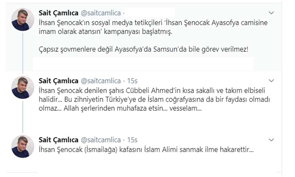 "İhsan Şenocak denilen şahıs Cübbeli Ahmed’in kısa sakallı ve takım elbiseli halidir... Bu zihniyetin Türkiye’ye de İslam coğrafyasına da bir faydası olmadı olmaz... Allah şerlerinden muhafaza etsin" diyen Çamlıca, "İhsan Şenocak (İsmailağa) kafasını İslam Alimi sanmak ilme hakarettir..." dedi.