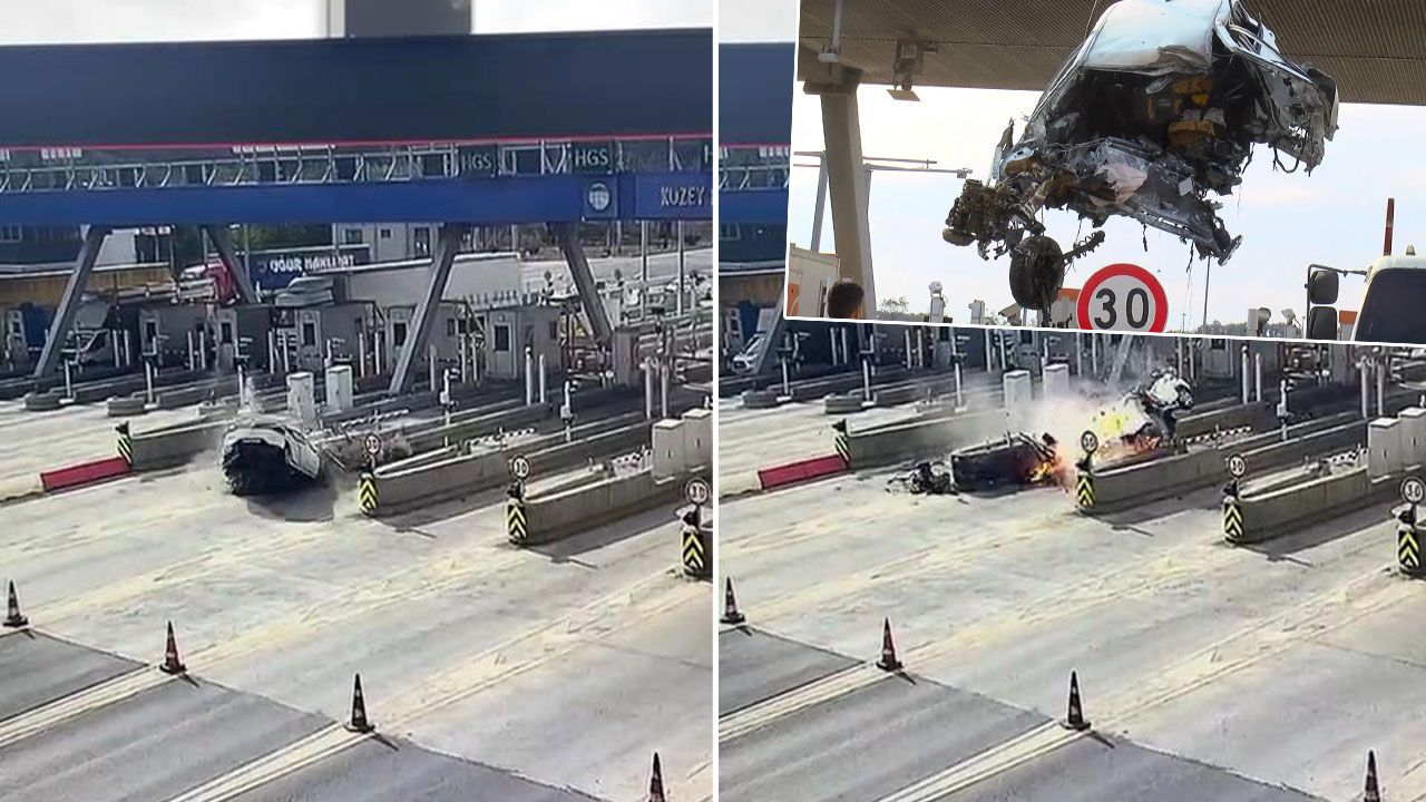 Görüntülerde, hızla gelen otomobilin bariyerlere çarptıktan sonra alev aldığı görülüyor.