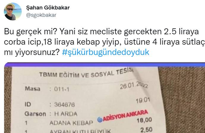 Gökbakar, TBMM Eğitim ve Sosyal Tesisi’ne ait olan adisyonun fotoğrafına “Bu gerçek mi? Yani siz mecliste gerçekten 2.5 liraya çorba içip,18 liraya kebap yiyip, üstüne 4 liraya sütlaç mı yiyorsunuz? #şükürbugündedoyduk” notunu düştü.