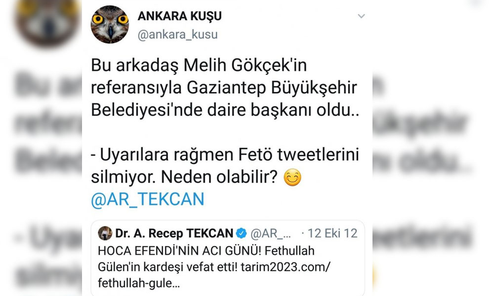 Twitter'da "Ankara Kuşu" adıyla bilinen, AKP'de yaşananlar ile parti içi muhalefetin yeni parti kurma süreci ile ilgili bilgiler paylaşan hesaptan, Melih Gökçek ile ilgili dikkat çeken bir paylaşım geldi. Ankara Kuşu adlı hesabın yaptığı paylaşımda, Gaziantep Büyükşehir Belediyesi Basın Yayın ve Halkla ilişkiler Daire Başkanı Ahmet Recep Tekcan’ın Melih Gökçek'in referansı ile bu göreve getirildiği belirtilerek, Tekcan'ın 2012'de FETÖ elebaşı Fethullah Gülen için yaptığı paylaşım hatırlatıldı. Ankara Kuşu adlı hesap, Tekcan'ın Gaziantep Büyükşehir Belediyesi Basın Yayın ve Halkla ilişkiler Daire Başkanı olmasında Melih Gökçek'in referans olduğunu belirten paylaşımına da yer verirken, Tekcan'ın Fethullah Gülen ile ilgili paylaşımını silmemesi ise dikkat çekti.