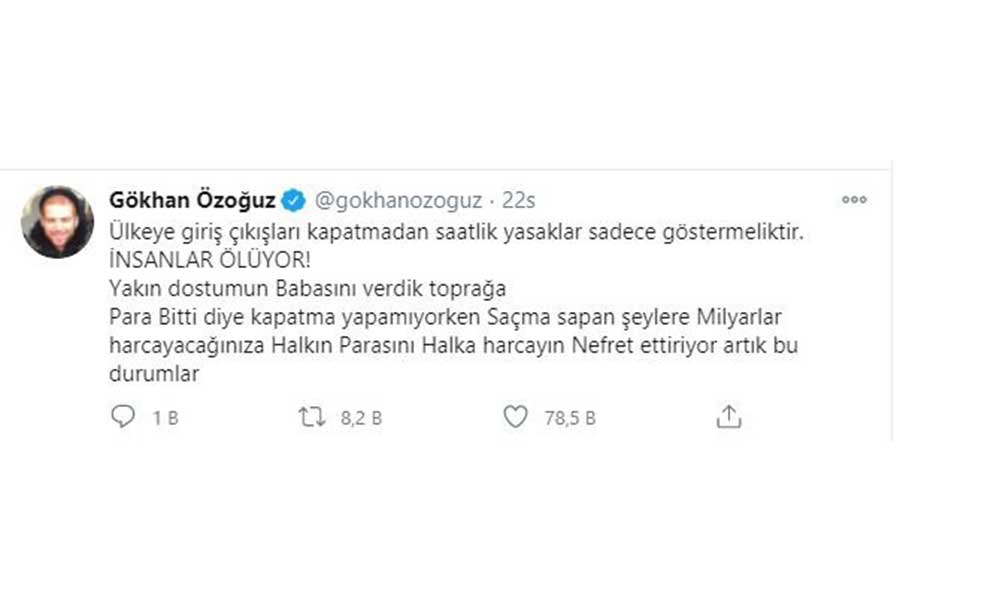 Şarkıcı Gökhan Özoğuz sosyal medya hesabından yaptığı paylaşımda, “Ülkeye giriş çıkışları kapatmadan saatlik yasaklar sadece göstermeliktir. İNSANLAR ÖLÜYOR. Para Bitti diye kapatma yapamıyorken Saçma sapan şeylere Milyarlar harcayacağınıza Halkın Parasını Halka harcayın Nefret ettiriyor artık bu durumlar” ifadelerini kullandı. Korona virüs vakalarında görülen artış sonrası hafta sonları saat 10:00-22:00 saatleri dışında sokağa çıkma yasağı ilan edildi. Athena’nın solisti Gökhan Özoğuz, bu karara sosyal medya hesabından isyan etti.“NEFRET ETTİRİYOR ARTIK BU DURUMLAR”